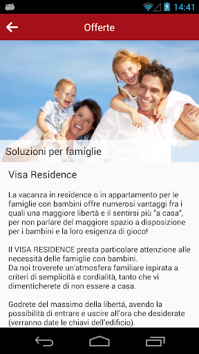 Visa Residence, a Bari, è lieto di presentarvi la sua nuova applicazione per smartphone e tablet. Se avete intenzione di trascorrere del tempo nella splendida Bari, sia per turismo, lavoro o studio, Visa Residence vi offre l'ospitalità di cui avete bisogno. Grazie a questa ricchissima App potrete conoscere tutte le nostre soluzioni ed offerte: monolocali, bilocali e trilocali a vostra disposizione, come anche tantissimi comfort e la massima libertà di gestione degli spazi senza dover sottostare ad orari vincolanti. Con la App potrete sempre restare in contatto con noi, conoscere le promozioni in corso, gli eventi della zona, consultare le tariffe ed anche prenotare, direttamente dal sito booking o dalla App, la vostra sistemazione. Che aspettate: Bari e Visa Residence aspettano solo voi!