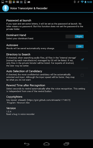 Audio-typing and/or transcription is very exhausted, isn't it? I have suffered from inputting with keyboard and inflammation of a tendon. Accordingly, I developed the transcription application with the Google's Voice Recognition is very excellent. Let's be free of troubles with this application. You can use as voice memos.