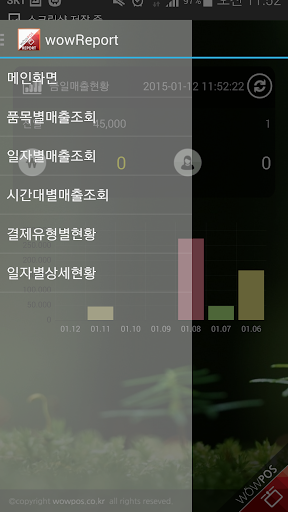 - 금일매출현황, 품목별, 일자별, 시간대별, 결제, 상세현황등의 모바일로 조회가능합니다.