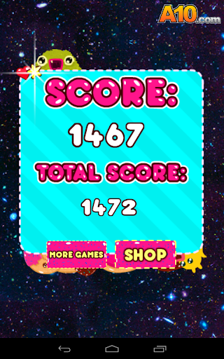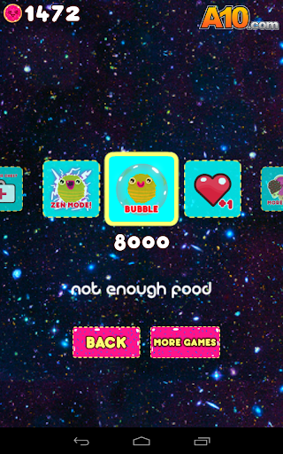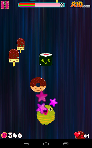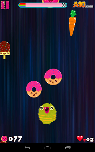 You’ve got to think fast to keep up with this high-flying customer! Someone flicked a blob of wasabi (the spicy Japanese horseradish paste) into space – where the condiment promptly developed a healthy appetite of its own. Wasabi hates healthy foods like veggies, but just loves junk food, especially donuts. Luckily for you both, space is littered with carrots, cupcakes, and other tasty items. Avoid the veggies, go for the treats, and you and your green friend are going to go far!
