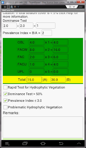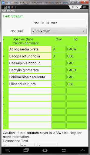 The regional versions of the COE as well as the most recent changes to the National Wetland Plant List (April 2014) are incorporated in this highly automated data entry form. WetForm Android AGC includes an automatic lookup species list that includes over 13,000 taxa. When you look up a species, the indicator status is automatically filled in, and when you enter the cover value for that species, the dominance, prevalence and FAC-neutral calculations are automated.