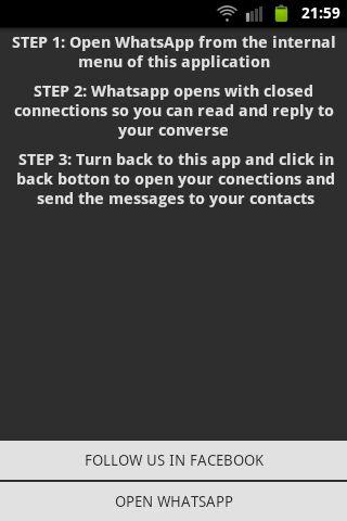 Sólo basta con abrir WhatsApp desde el menu de WhatsHide y leer o contestar tus conversas, y una vez salgas de la app, tus mensajes se enviaran y nadie se habrá enterado de tu conexión a WhatsApp.