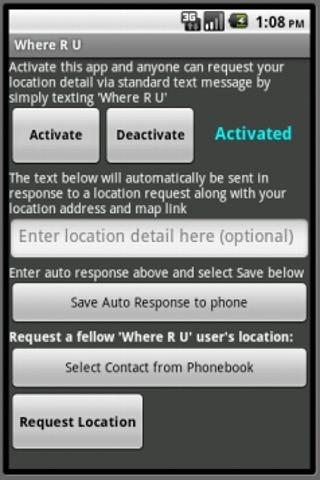 Once Activated, anyone can request your location details by simply texting your phone 'Where R U'. This App automatically replies with a user definable text (optional) along with your current address / Lat-Long position plus a link to map to that address.