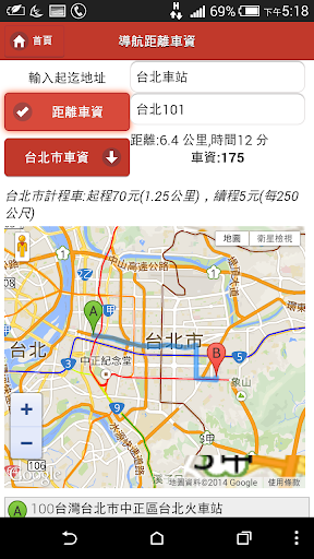 輸入出發地、目的地,選擇車資(目前只先算台北市計程,後續再加),點選距離車資,預算出車資。
