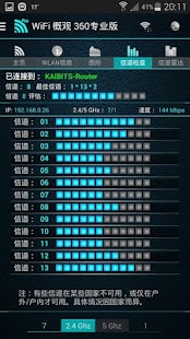 选项卡 "Ch Check" (信道检查器)和 "Ch. Radar" (信道雷达)是强大的 WLAN 网络优化工具。要使网络达到最佳新能,就必须使用其他无线网络不使用或较少使用的信道和频率范围。WiFi Overview 360 可帮你选择最佳信道。