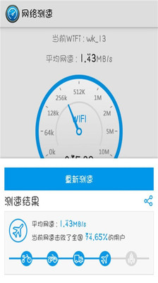 WiFi测速是一款测试您当前所用网络情况的工具,为您快速识别当前移动设备的网络情况,您可以用我们的工具对您当前设备使用的网络速度进行检测,还可以和小伙伴们PK一下谁的网络更给力,轻松的为用户找到目前可用的更快的wifi,让用户的wifi冲浪更加便捷快速。