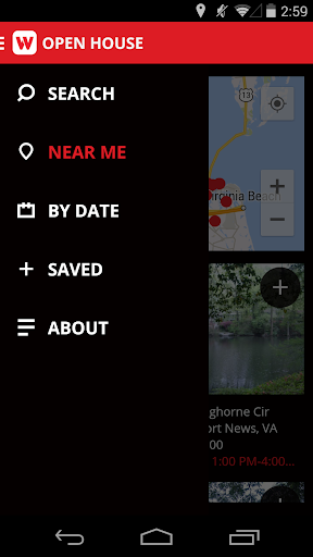 Near Me maps all open houses near your current location. Drag the map in any direction to see open houses within a defined area, and zoom in and out to focus on smaller or larger areas. Tap a map pin to view the open house information, or scroll through the thumbnail list of homes.