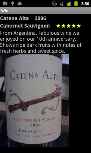 All of your wine entries are shown in a table where you can sort them by vineyard, variety, year, or rating. At any time you can view the details and picture associated with any entry. This is extremely handy when you're at the restaurant or store, and you're trying to find a wine you've tasted and you know to be good.