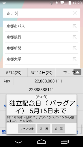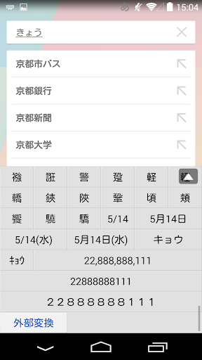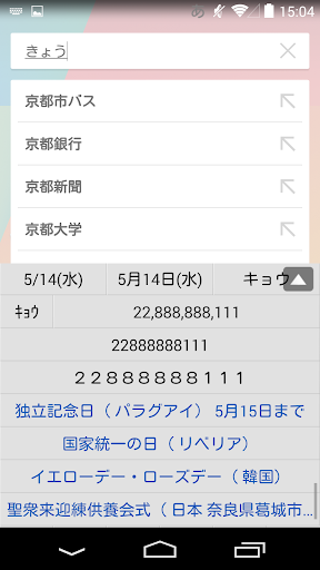 ・「きょう」「あした」「あさって」「しあさって」「きのう」「おとつい」「おととい」を入力して、候補リストの最後に表示される「外部変換」をタップすると、「今日は何の日」情報が取得できます。