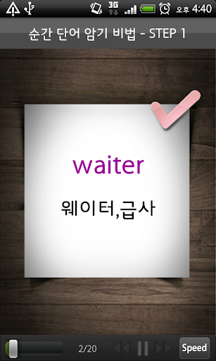 손가락을 들어 화면을 터치해 주세요! 한 단어도 빠짐 없이 암기 할 수 있도록 도와 드립니다!