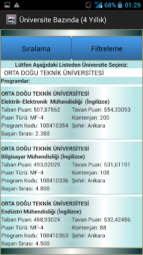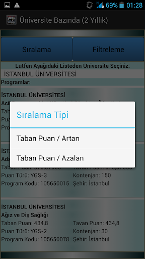 Uygulama içerisinde 2 yıllık önlisans ve 4 yıllık lisans programlarını ayrı ayrı görüntülersiniz. Bu tercihinizi yaptıktan sonra dilediğiniz yüksek öğretim programının; Program Kodu, Üniversite, Bölüm, Puan Türü, Kontenjan, Taban Puan, Tavan Puan, Şehir verilerine, sıralama ve filtreleme seçenekleri ile birlikte ulaşırsınız. Seçtiğiniz arama türüne göre listelediğiniz bölümleri taban puanlarına göre artan/azalan şekilde sıralayabilir ve eğer isterseniz listelenen sonuçları İkinci Öğretim, İngilizce, Ücretli, Tam Burslu, %25 Burslu, %50 Burslu, %75 Burslu seçeneklerine göre filtreleyebilirsiniz.