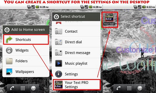 · A: The way may vary slightly between devices, but usually you can do that pressing for one second on a free area of the desktop, then select shortcuts, and select "Your Text LW Settings". The shortcut will appear on your desktop.