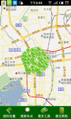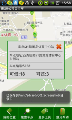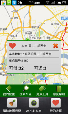 查询公共自行车,可以查询附近的车点,也可以在地图上指定地点进行查询,当然了,点击图标后还可以查询车辆的数目,新增收藏车点功能,24小时车点