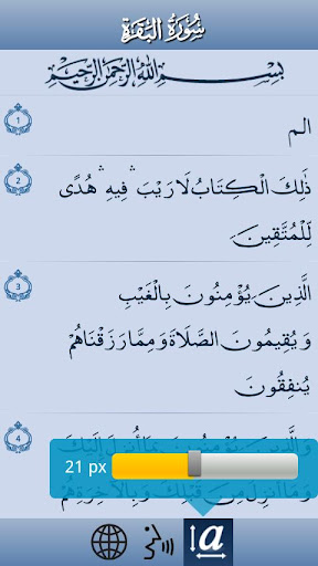 * Ability to switch Quran text language to Arabic, English or Phonetic.