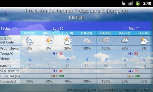 También podras saber el calendario lunar del mes y la pevisión del tiempo para toda la semana.
