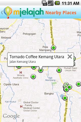 mJelajah identifies your location and helps you discover nearby places you normally need when travelling. It also allows you to "fly" to a specific place on the map and display interesting places there. You can also search for place types and names around an area.