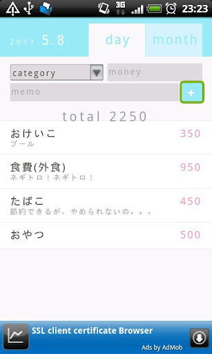 input category and the amount of money, a monthly pie chart and the sum total of each category can be checked.