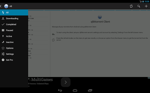 - To start using the app, you must set your qBittorrent server's settings and account by selecting 'Settings' from the left menu.