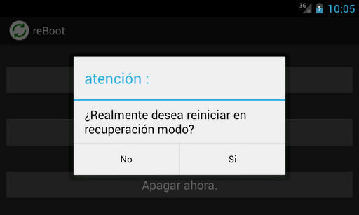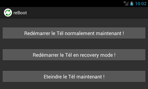 reBoot is a very simple and light app that allows you to restart, shutdown or switch to recovery mode your phone or tablet in only one simple clic.